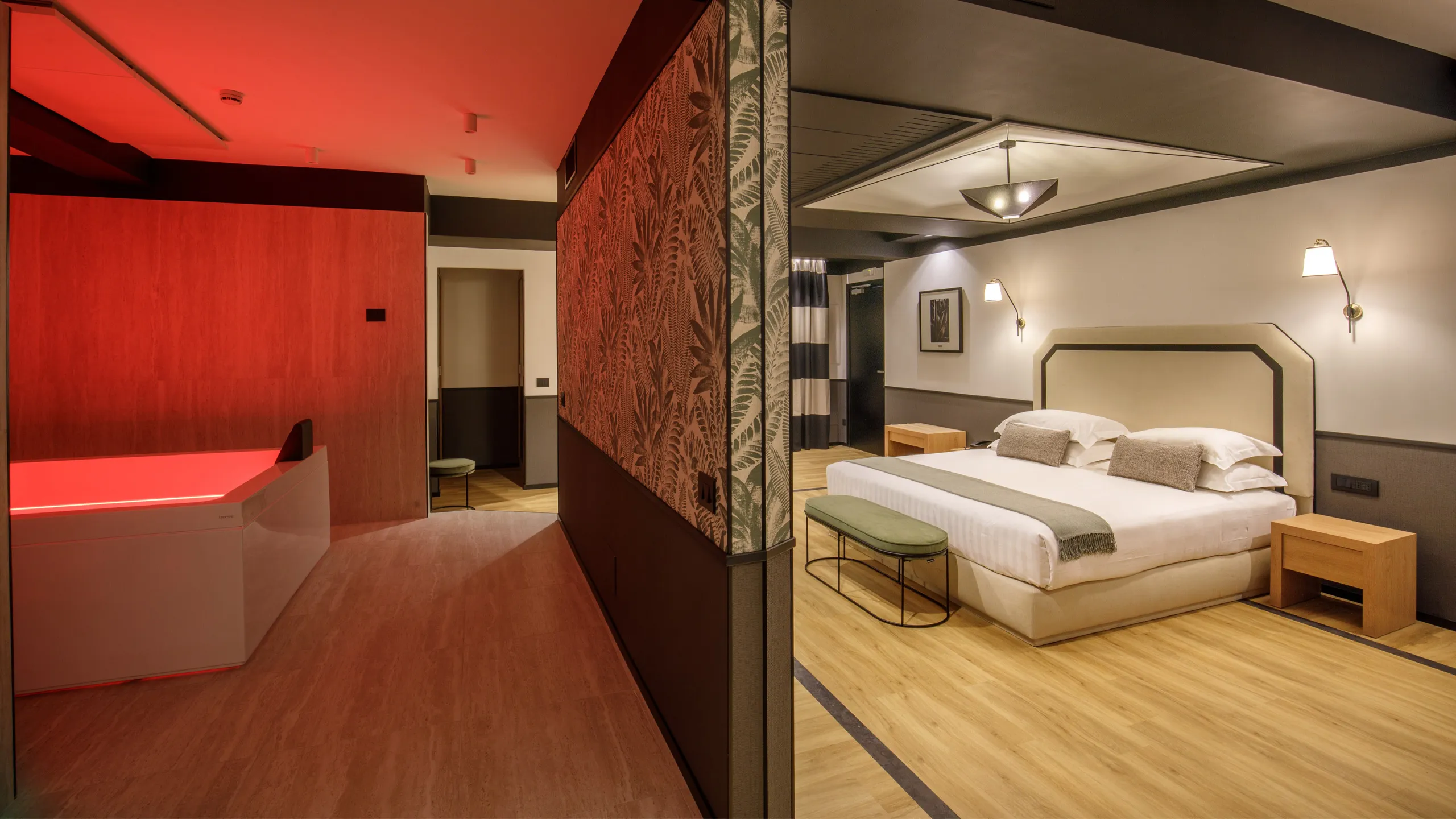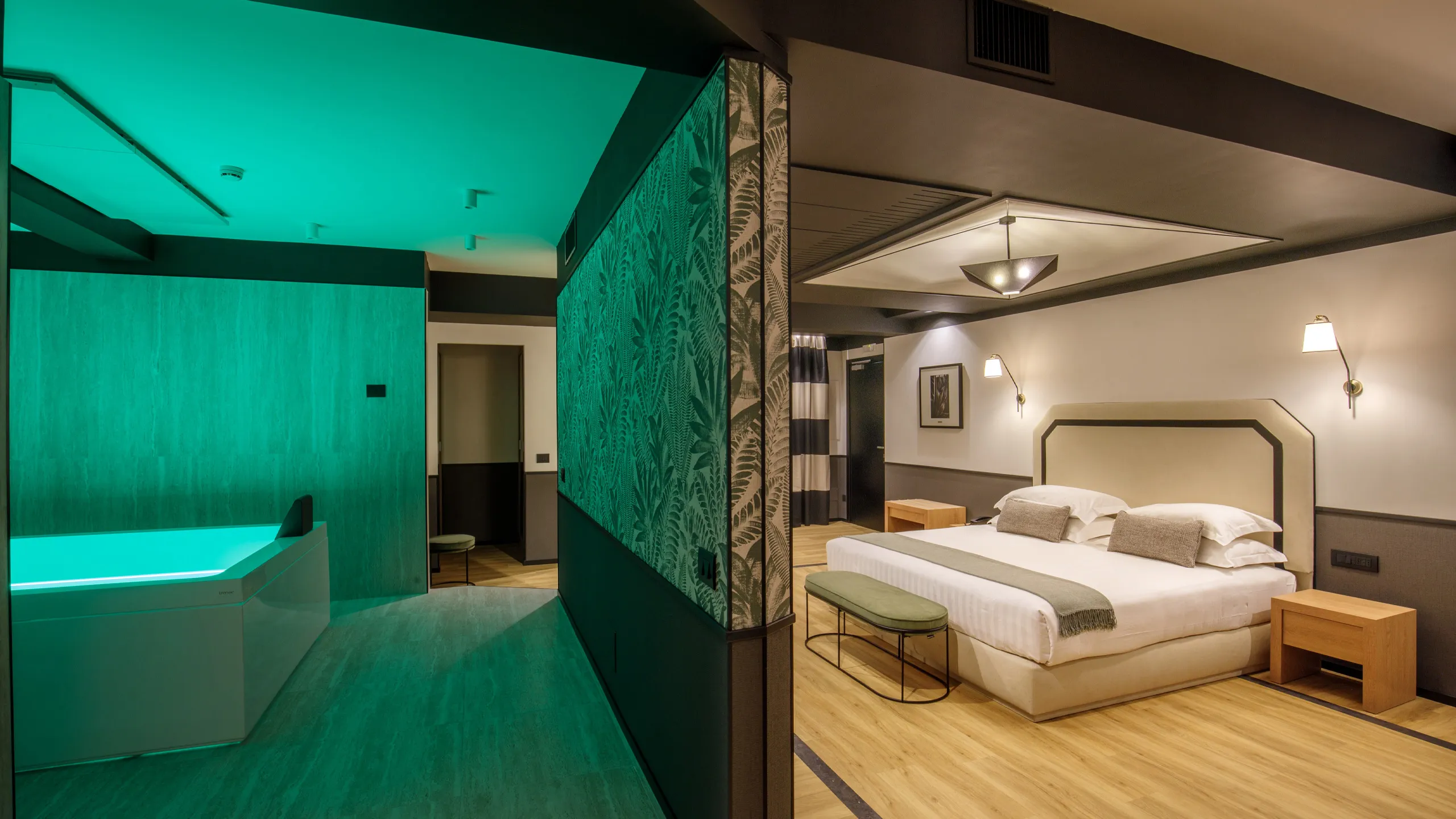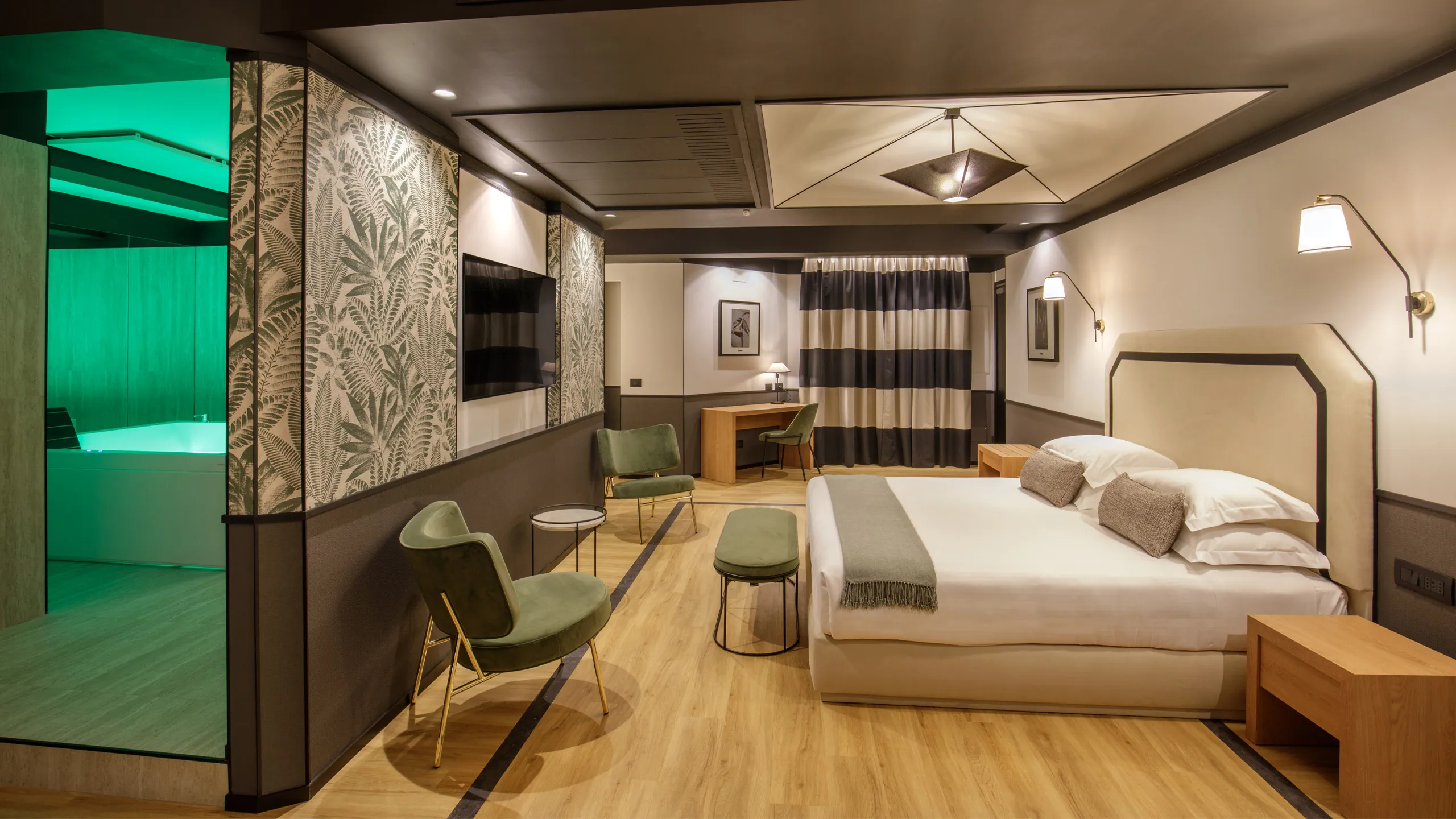 La Luxury Suite con Spa è un ambiente raffinato pensato per trasformare ogni soggiorno in un’esperienza di assoluto relax. Arredata con uno stile elegante e moderno, si distingue per le ampie finestre che inondano gli spazi di luce naturale, creando un’atmosfera luminosa e accogliente. Qui ogni dettaglio è progettato per fondere comfort contemporaneo e intimità.