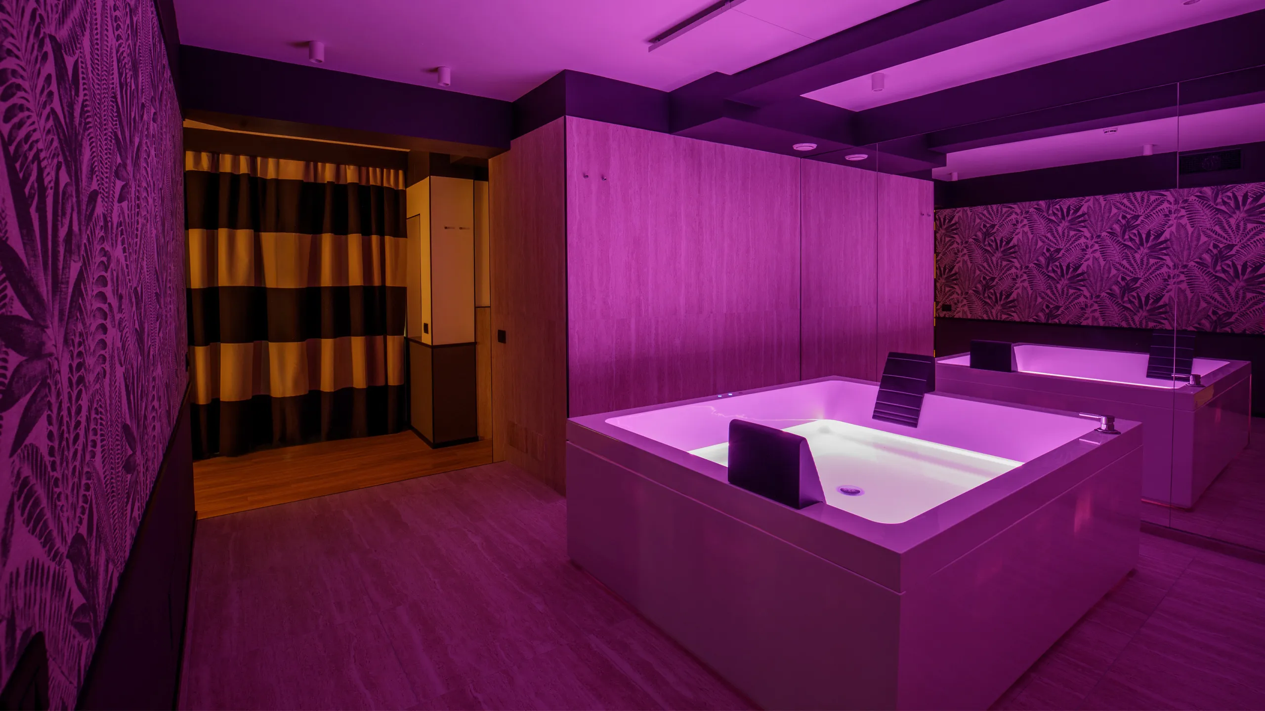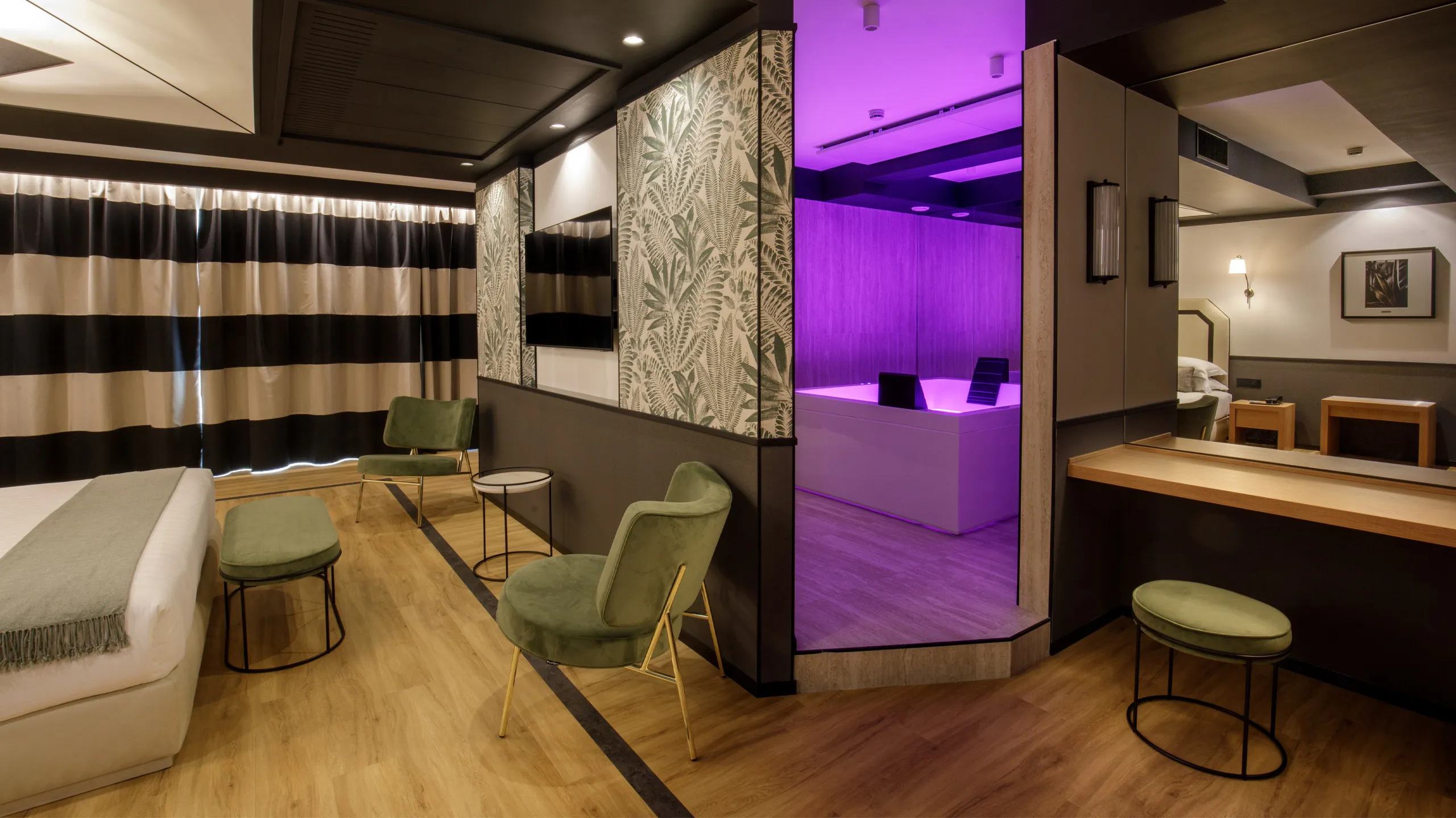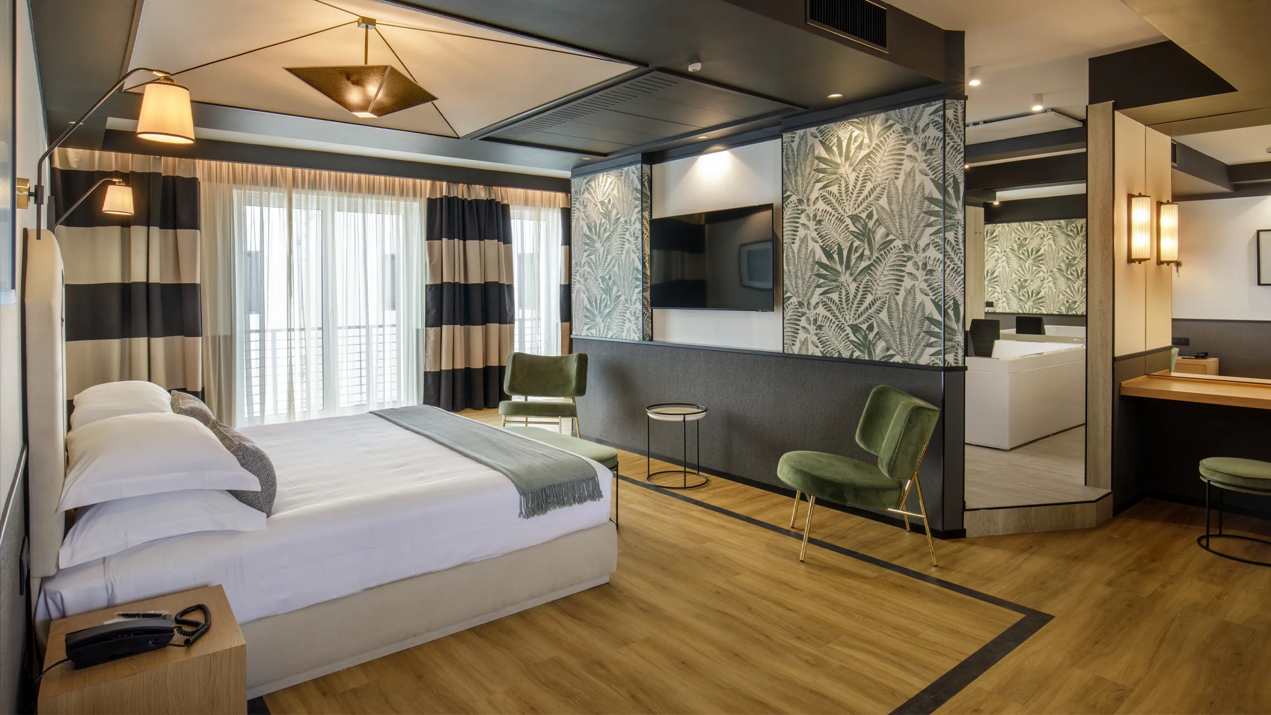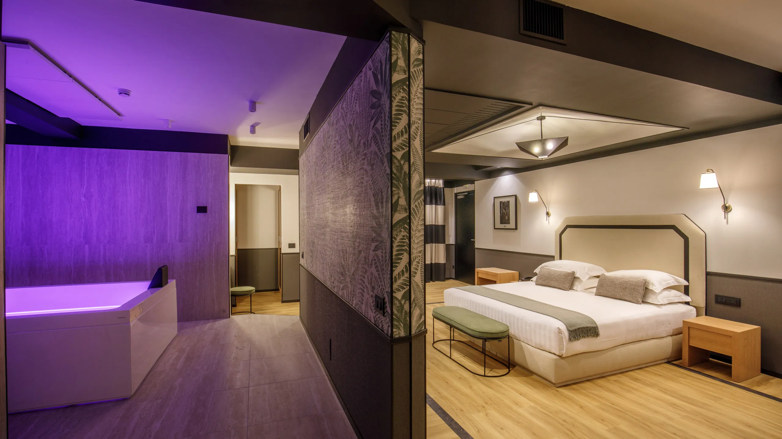 La Luxury Suite con Spa è un ambiente raffinato pensato per trasformare ogni soggiorno in un’esperienza di assoluto relax. Arredata con uno stile elegante e moderno, si distingue per le ampie finestre che inondano gli spazi di luce naturale, creando un’atmosfera luminosa e accogliente. Qui ogni dettaglio è progettato per fondere comfort contemporaneo e intimità.