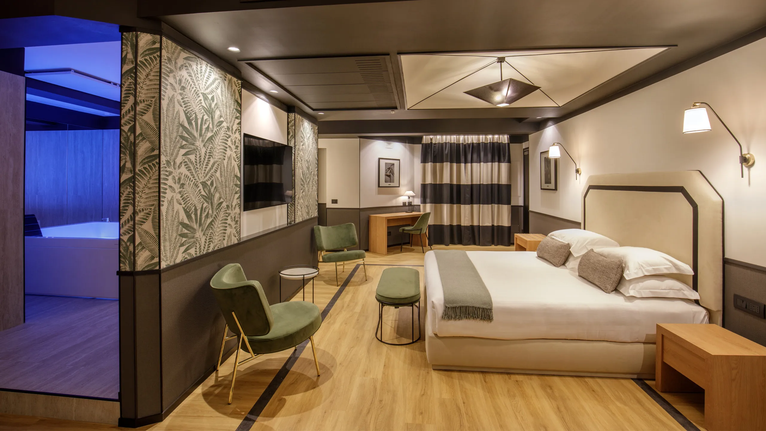 La Luxury Suite accoglie i suoi ospiti in un ambiente sofisticato, curato in ogni dettaglio per offrire un’esperienza di soggiorno senza pari. Gli arredi sono stati scelti tra finiture pregiate e materiali di alta qualità, creando un equilibrio armonioso tra design e funzionalità. Il soggiorno ampio, con divani avvolgenti e una TV multimediale da 55’’, invita a rilassarsi in un’atmosfera intima e contemporanea. Ogni elemento contribuisce a trasformare la suite in uno spazio unico, perfetto per momenti di quiete e di stile.
